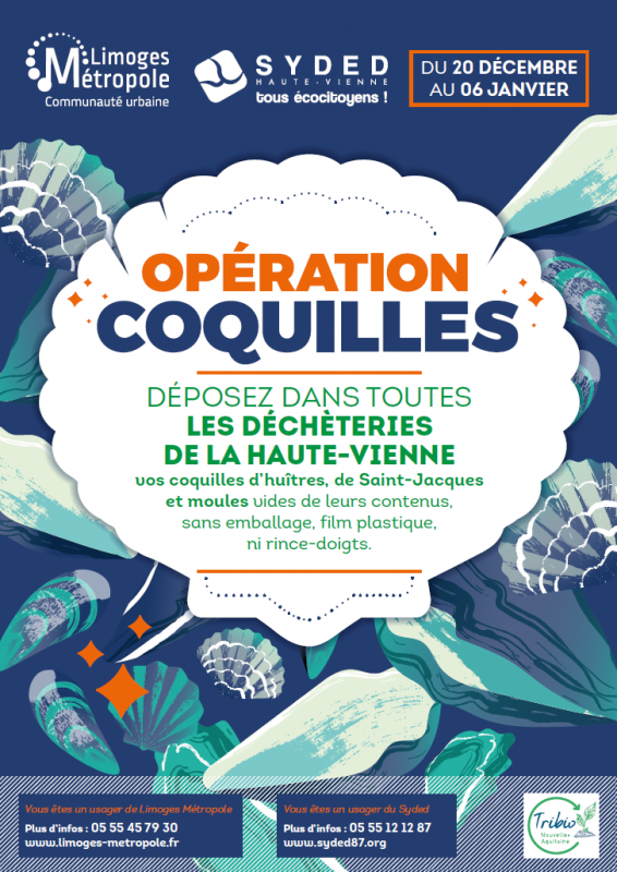 À l'approche des fêtes de fin d'année, Limoges Métropole et le SYDED Haute-Vienne renouvellent leur traditionnelle opération de collecte de coquilles d'huîtres, de moules et de Saint-Jacques. Elle se déroulera du samedi 20 décembre 2025 au mardi 6 janvier 2026 sur l'ensemble des déchèteries du territoire.