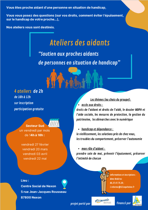 Dans le cadre d'un appel à projet porté par le Conseil Départemental 87, l'association "T21somie" propose des ateliers d'information pour les aidants de personnes en situation de handicap (quelque soit le type de handicap, l'âge de l'aidant, le lien de parenté et la situation familiale).