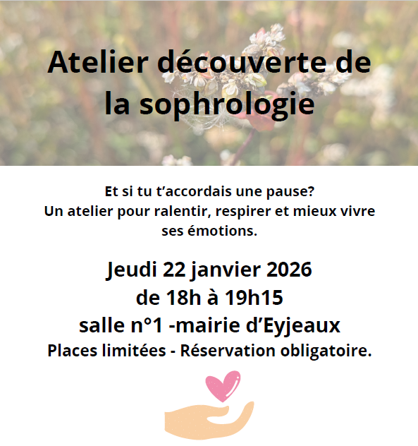 Sophr'Audrey vous propose jeudi 22 janvier 2026 de 18h à 19h15 un temps de découverte pour comprendre ce qu’est la sophrologie et expérimenter des exercices simples de respiration et de détente, accessibles à tous.