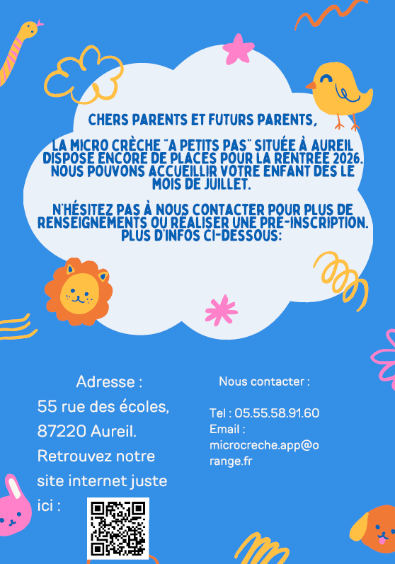 La micro crèche "A Petits Pas" située à Aureil dispose encore de quelques places pour la rentrée 2026. Les enfants pourront être accueillis dès le mois de juillet.